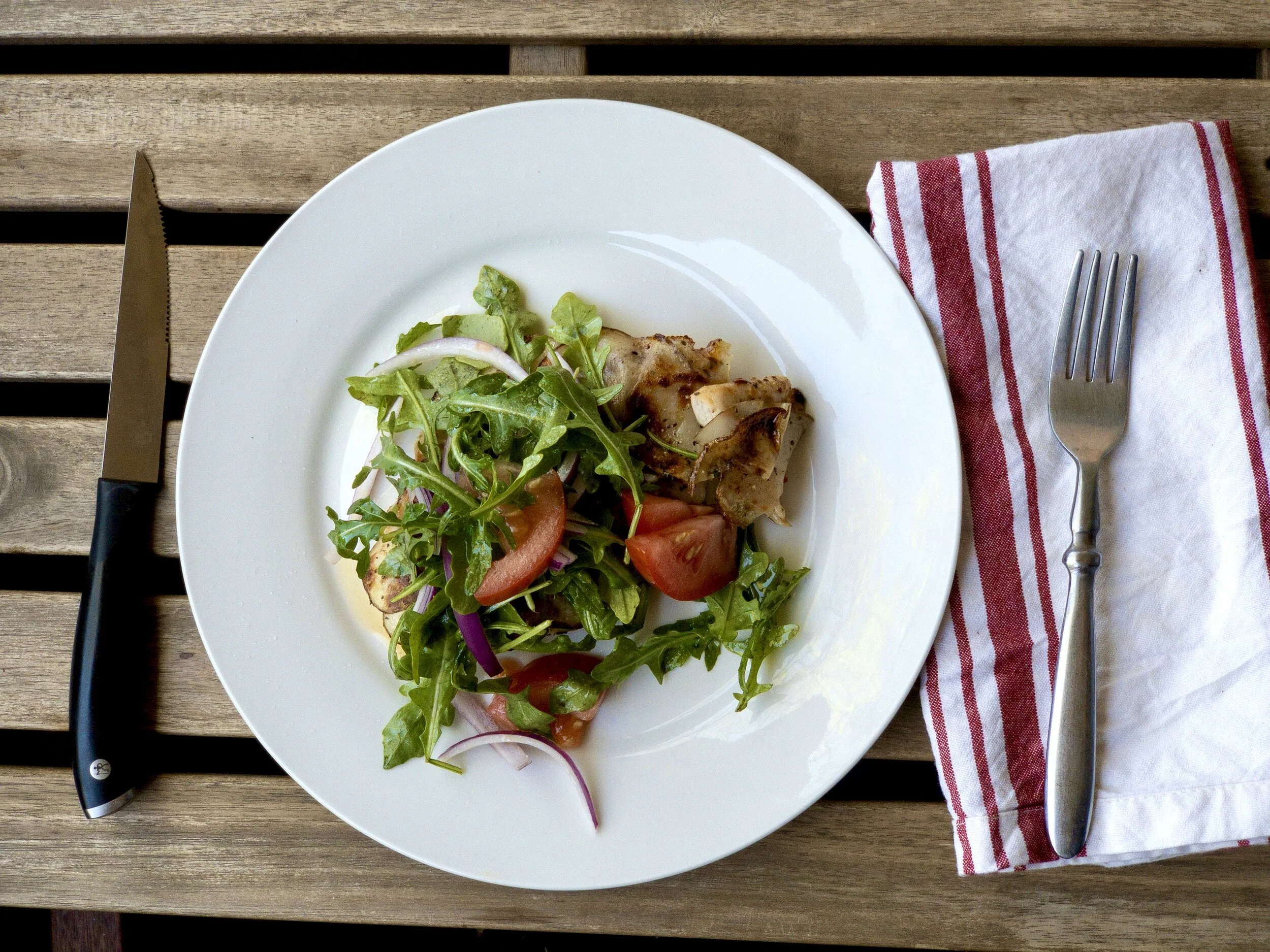 5. Meanwhile, toss the tomato, onion, and arugula together in a bowl with a light drizzle of olive oil. Arrange the salad on top of the chicken, and serve cut into wedges like a pizza.